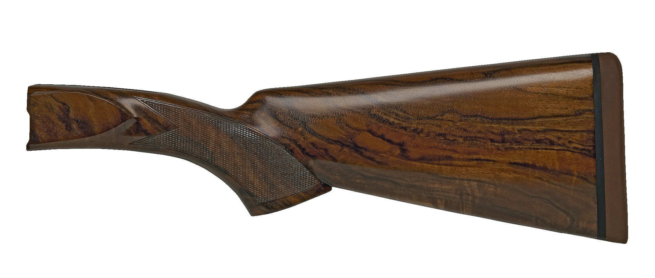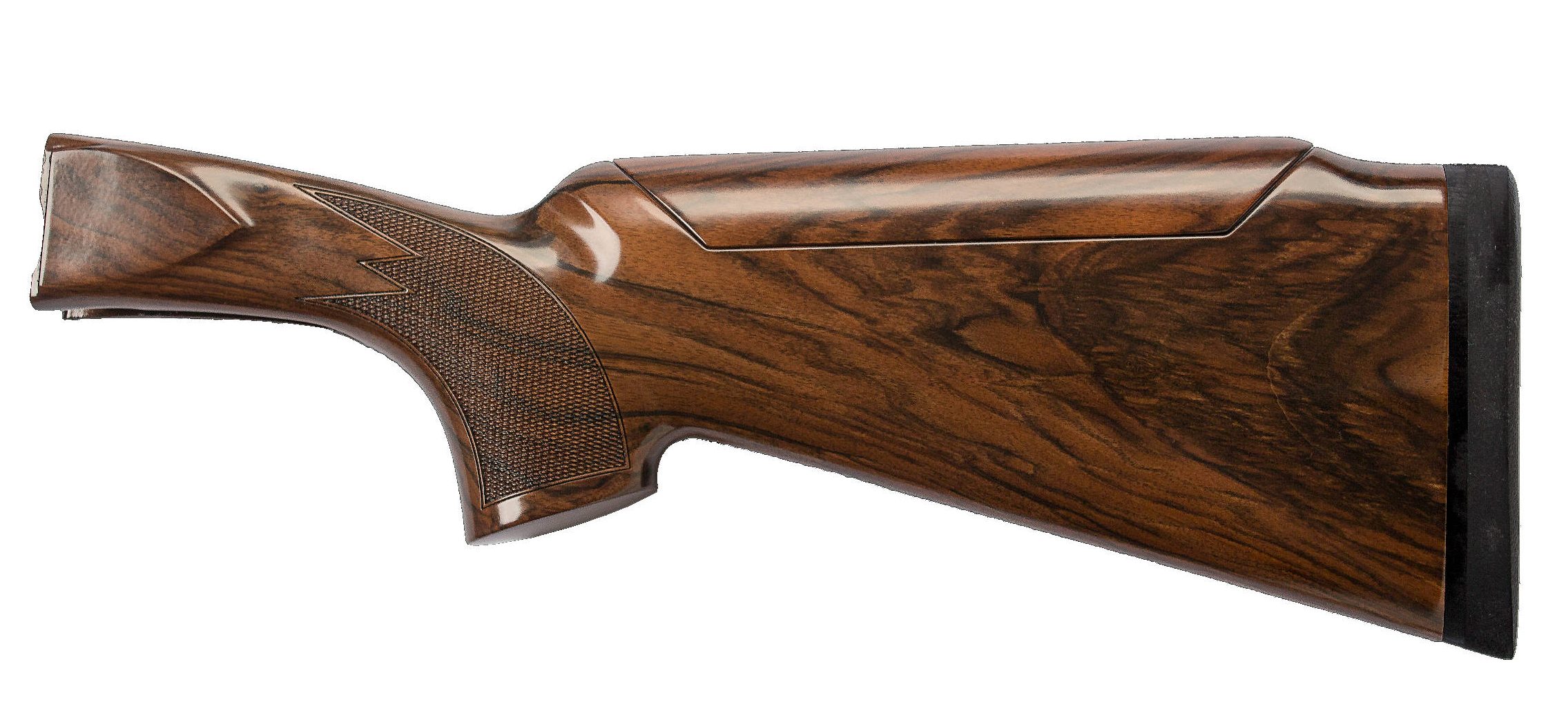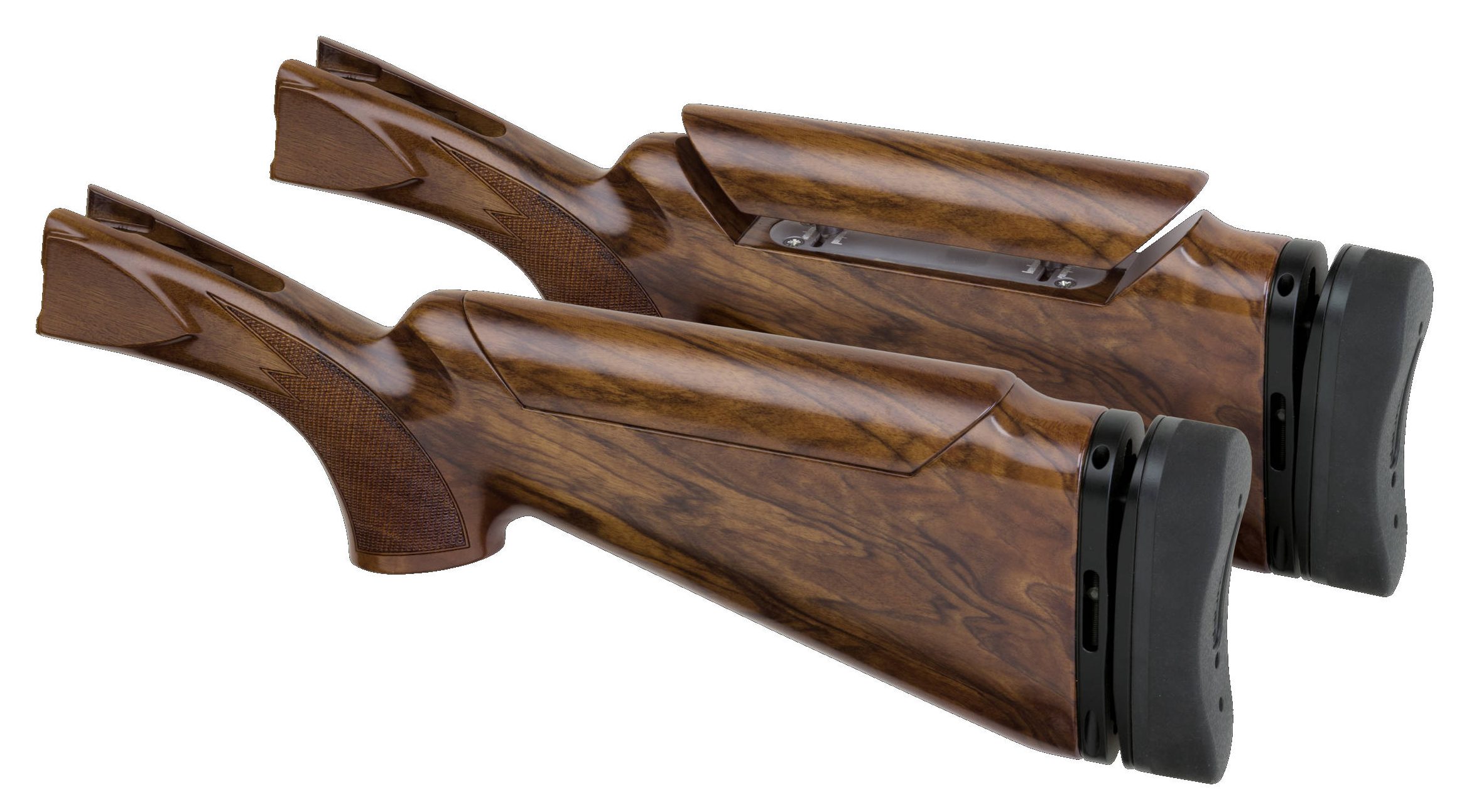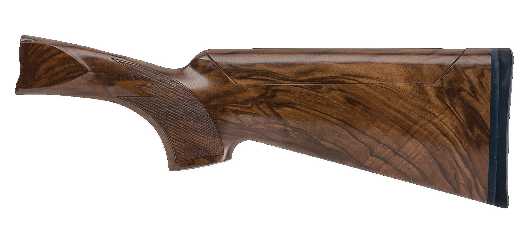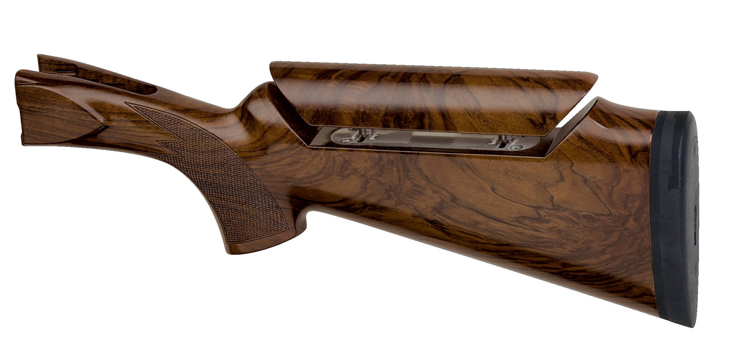 The Sporter Stock has an adjustable comb and is designed for either pre-mounted shooting or shooting from a gun down position. It's been designed for either a right-handed or left-handed shooter with appropriate cast-on and cast-off to put the barrel and rib under the shooting eye. The pistol grip with palm swell places the wrist in a controlling angle minimizing fatigue and stress during recoil. It comes standard with a Pachmayr recoil pad with reinforced heel for snag-less mounts and less recoil. The easy adjustability of the comb along with the ability to make a flawless mount, make this a top choice among sporting and FITASC shooters.